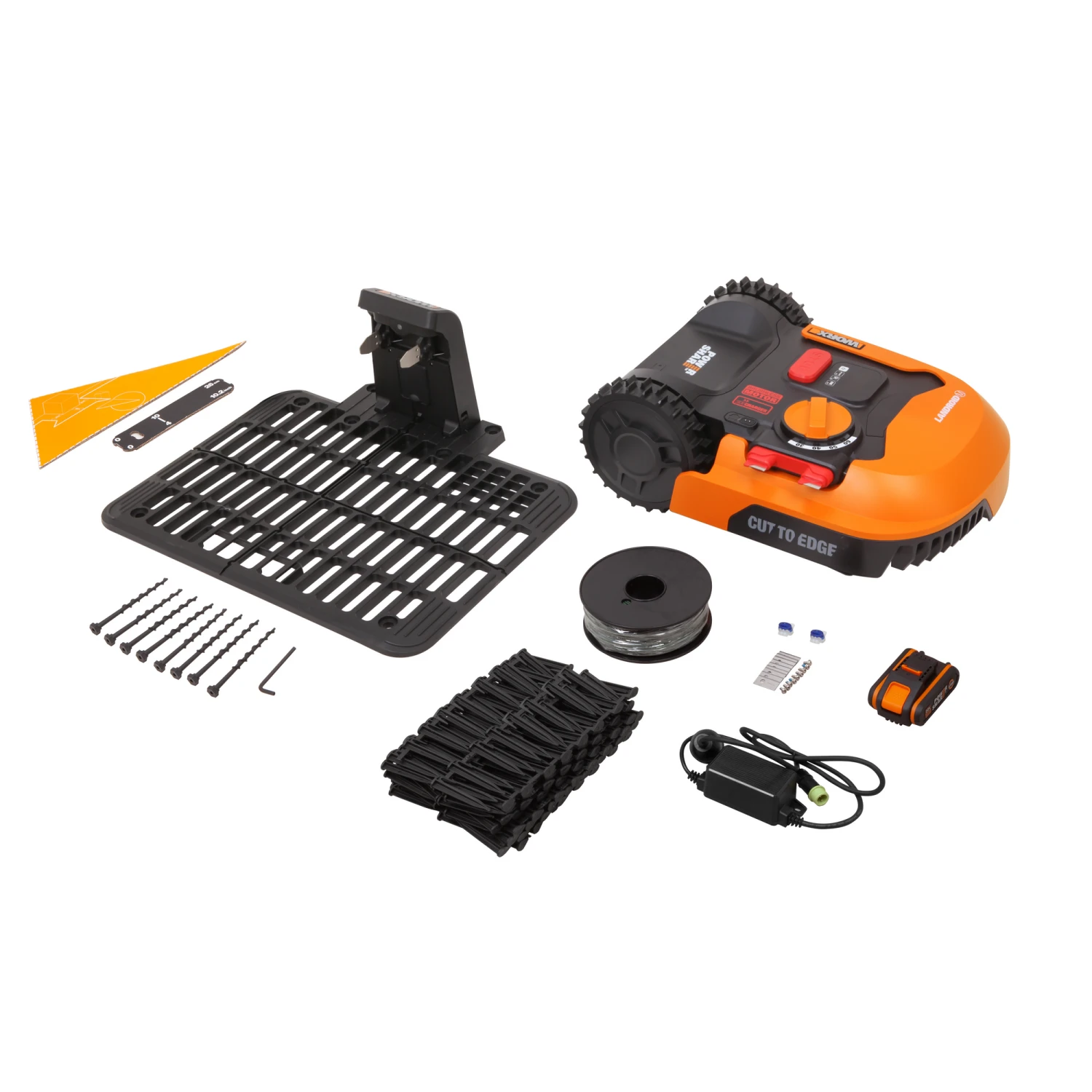 Lieferumfang: Mährobotor, 1 x Akku, 1 x Ladenetzteil, 1 x Ladestation, 9 Messer und Schrauben, 130 m Begrenzungsdraht, 180 Heringe, 1 x Schraubenschlüssel, 8 Nägel zur Befestigung der Ladestation